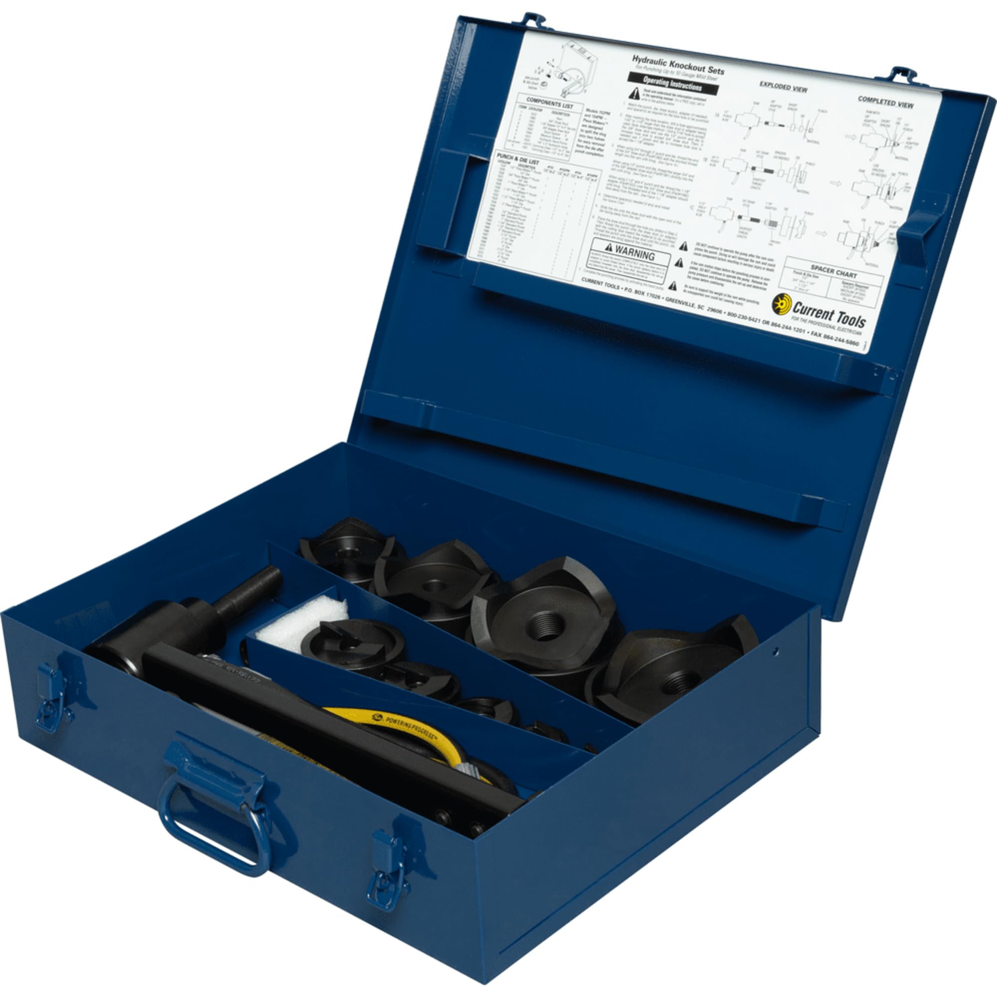 Le kit de poinçons hydrauliques Current Tools 154PM 1/2"–4" Piece Maker™ est conçu pour diviser le bouchon en deux morceaux pour un retrait facile, nécessitant moins de force que les poinçons conventionnels. Il comprend des poinçons et des matrices en acier haute résistance pour une longue durée de vie, une pompe manuelle unique avec un vérin robuste, et peut perforer jusqu'à de l'acier doux de calibre 10 (.134"). Le kit est fourni avec une mallette en métal pour le transport et l'organisation.