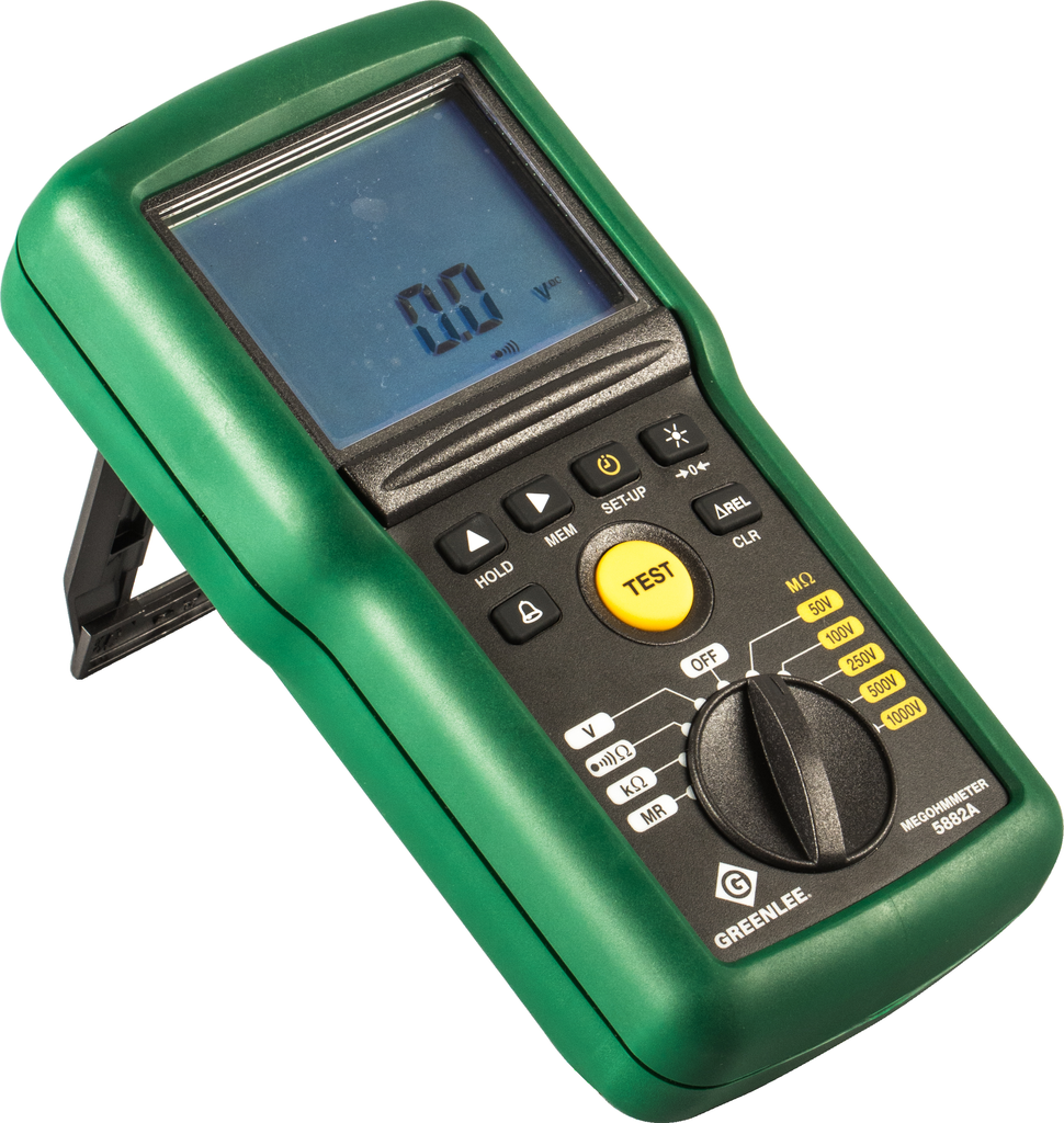 Le Greenlee 5882A Megohmmètre/Analyseur d’Isolation 1 kV permet de tester la résistance d’isolation des câbles et équipements rotatifs avec des tensions d’essai de 50 V, 100 V, 250 V, 500 V et 1 kV. Il intègre une décharge automatique, une plage de 10 kΩ à 200 GΩ, une fonction mémoire de 300 lectures, un écran LCD haute luminosité avec bar-graphe et une cote de sécurité CAT IV 600 V.