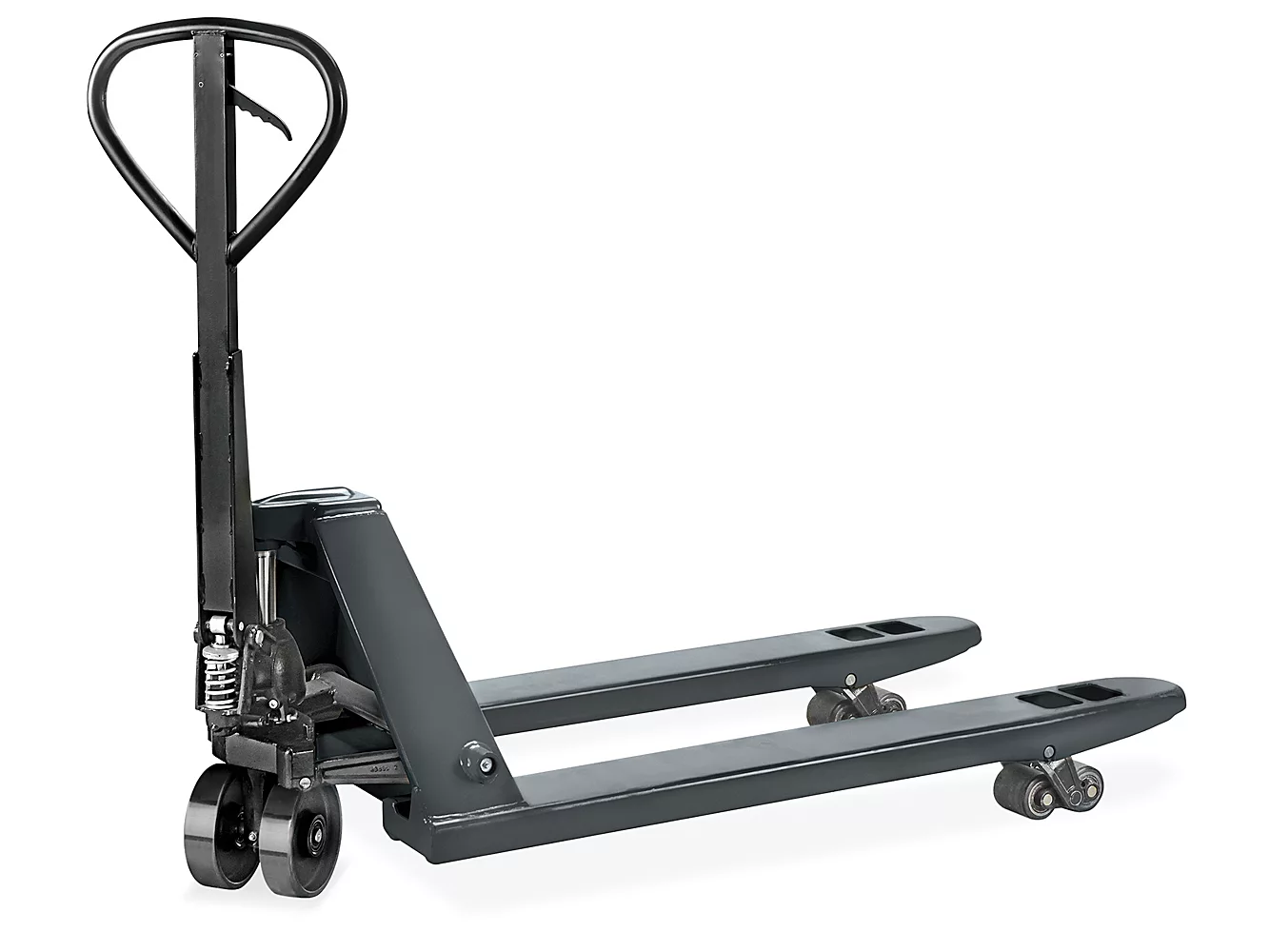 Le transpalette robuste de Uline mesure 48" x 27" et supporte jusqu'à 2 498 kg (1 100 lb). Son cadre en acier renforcé et sa poignée ergonomique assurent durabilité et facilité d'utilisation. Les roues en polyuréthane offrent un déplacement fluide sur diverses surfaces.