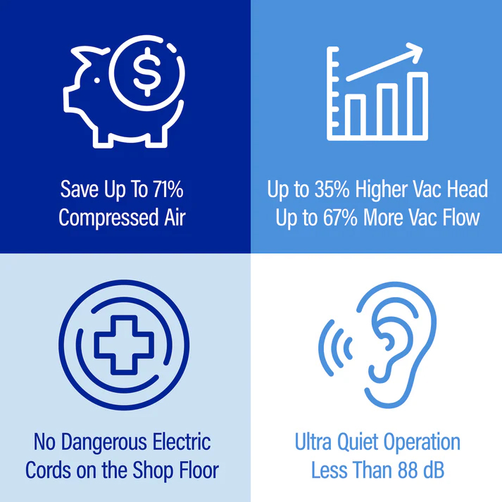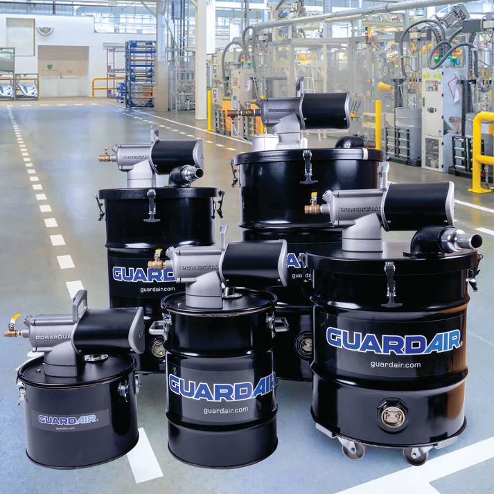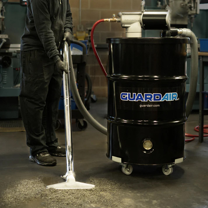 L’aspirateur Guardair N551BC de 55 gallons fonctionne uniquement à l’air comprimé — sans moteur ni câbles. Sa tête Venturi délivre jusqu’à 185 po de colonne d’eau et 89 CFM d’aspiration, suffisant pour aspirer copeaux, poussières, débris, la plupart des liquides ou boues. L’ensemble comprend un fût en acier de 55 gal sur chariot, un tuyau d’aspiration de 2″ × 20′, un outil plancher métal pour sec/humide, un suceur de coins, un tuyau d’alimentation 20′ et un filtre standard — idéal pour nettoyage intensif sur chantier.