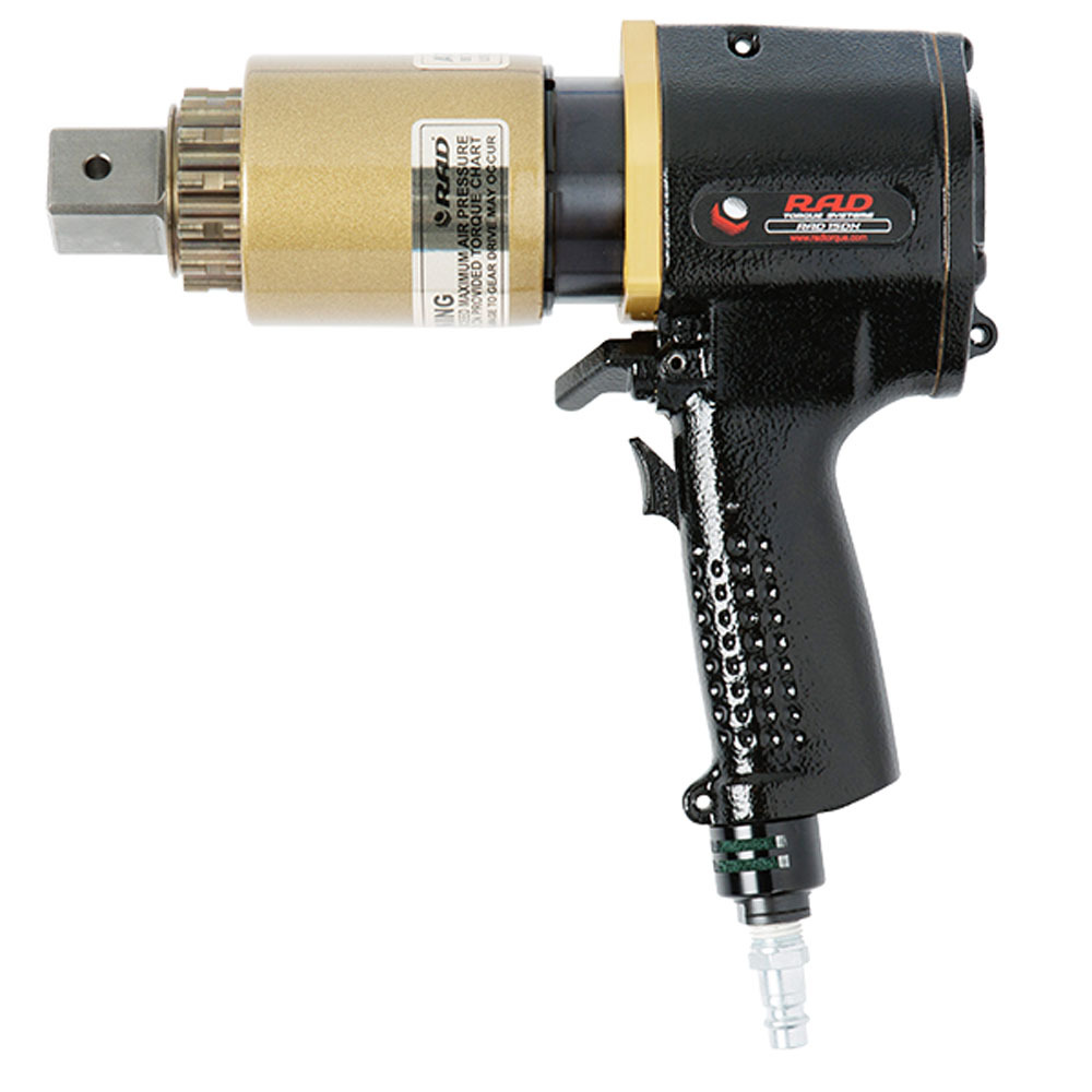 The RAD 34GX pneumatic torque wrench delivers 1,000–3,400 ft-lbs of torque with a 1" square drive. Weighing just 20 lbs, it offers a superior power-to-weight ratio for extreme-duty applications. Features include ±5% accuracy, ±2% repeatability, and a compact design for tight spaces. Each tool is fully calibrated and comes with a reaction arm, retention ring, 12" hose, ergonomic regulator cage, tool holder, and calibration chart.