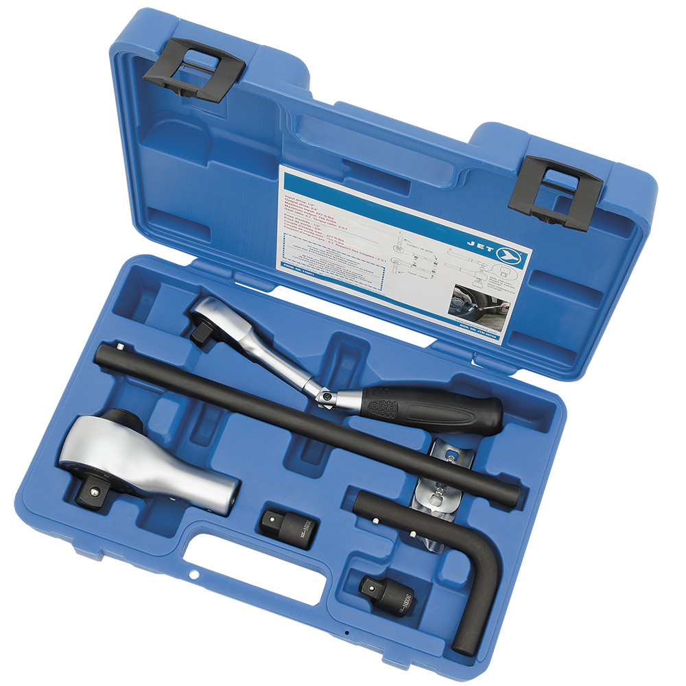 The Jet 719072 JTM-51100 Torque Multiplier Kit delivers up to 1,100 ft-lbs of torque with a 1/2" input and 3/4" output drive. Featuring a 6.5:1 torque ratio and planetary gear system, it reduces physical effort while enhancing accuracy. Includes straight and 90° reaction bars, reaction base, breakaway input adaptor, and a durable storage case. Ideal for high-torque applications like lug nut tightening.