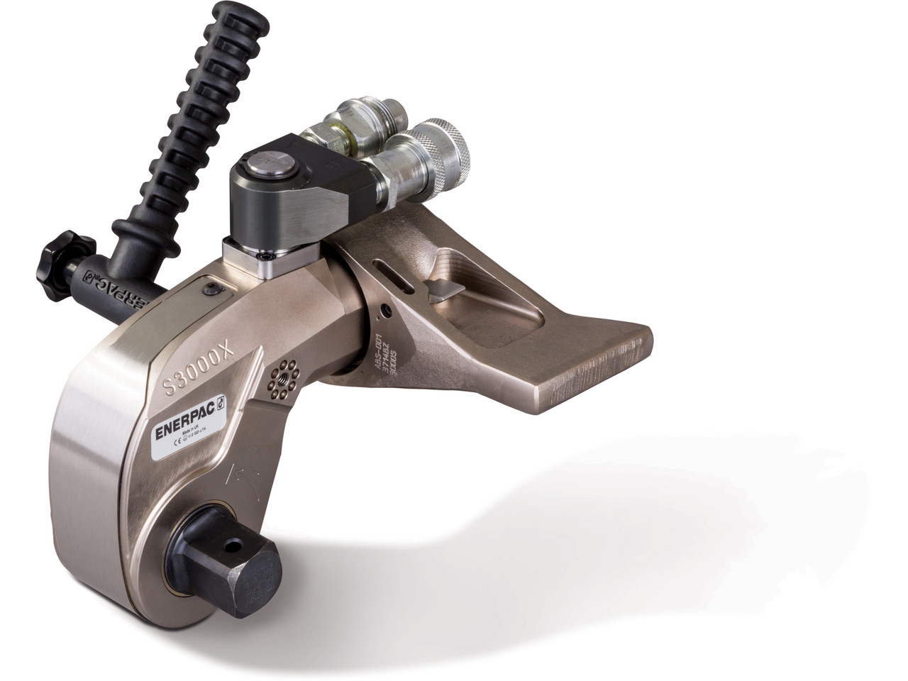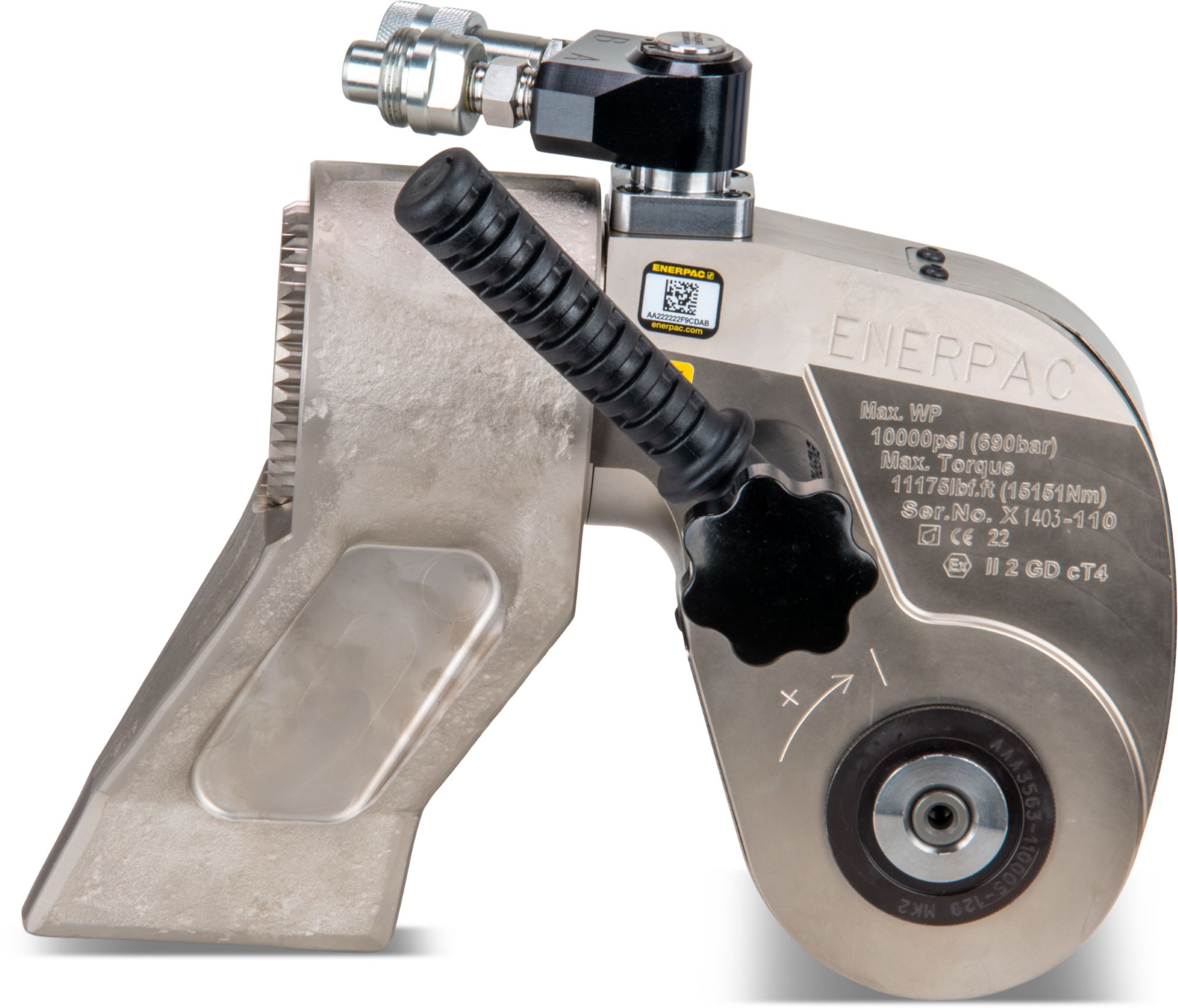 The Enerpac S11000PX hydraulic torque wrench delivers up to 11,175 ft-lbs of torque with a 1½" square drive. Its compact, high-strength uni-body design ensures durability and a small operating radius. Features include a 35° rotation angle, rapid return stroke, 360° click-on reaction arm with quick release lever, and a robust handle for enhanced maneuverability. The Pro Series Swivel TSP300 manifold allows for horizontal and vertical movement, providing greater durability and ease of use.