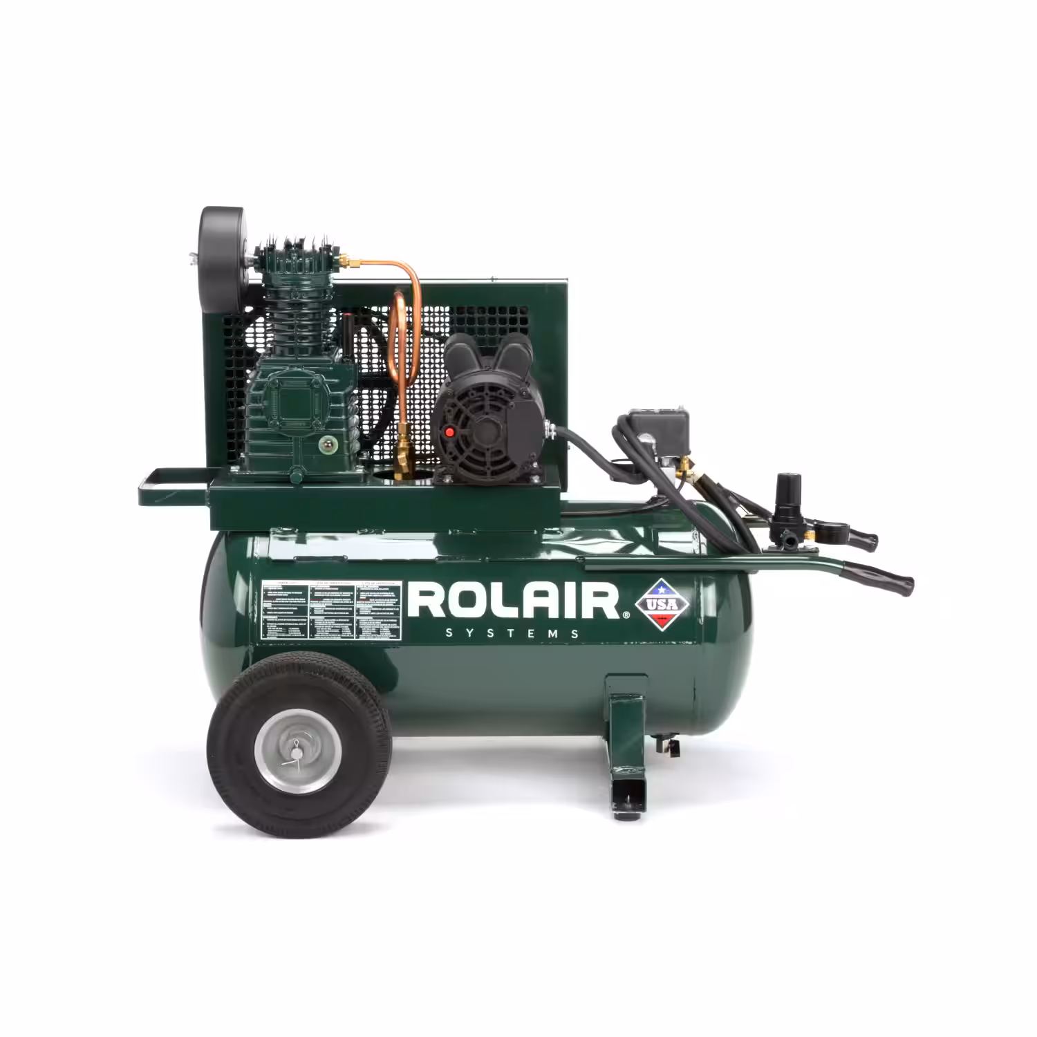 The Rolair 5520K17A is a wheeled electric air compressor with a 20-gal tank, cast-iron twin-cylinder pump, and 1.5 HP motor. It delivers 7.3 pi³/min at 90 psi for reliable job-site air supply. Built with splash lubrication and a durable steel belt guard for long service life.