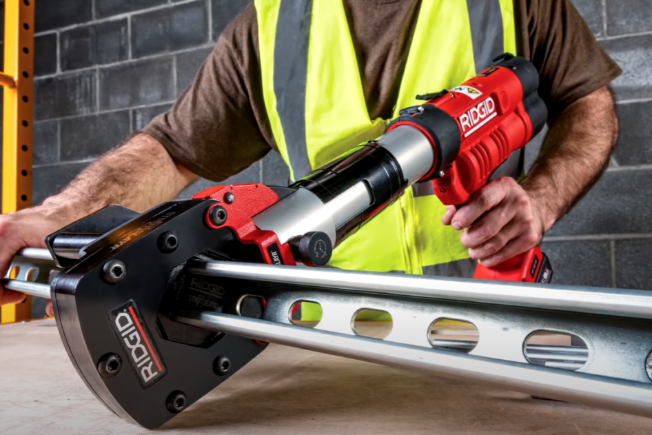 The RIDGID STRUTSLAYR is a strut-shear head that cleanly slices standard mild-steel strut (max 12-gauge, wall up to 2.5 mm) into 1-5/8″ × 1-5/8″ or 1-5/8″ × 13/16″ profiles in 5 s or less. When mounted on a compatible 32 kN press tool, it delivers chip-free, burr-free 90° cuts — no grinding, no sparks — with a built-in measuring guide for precision on the jobsite.