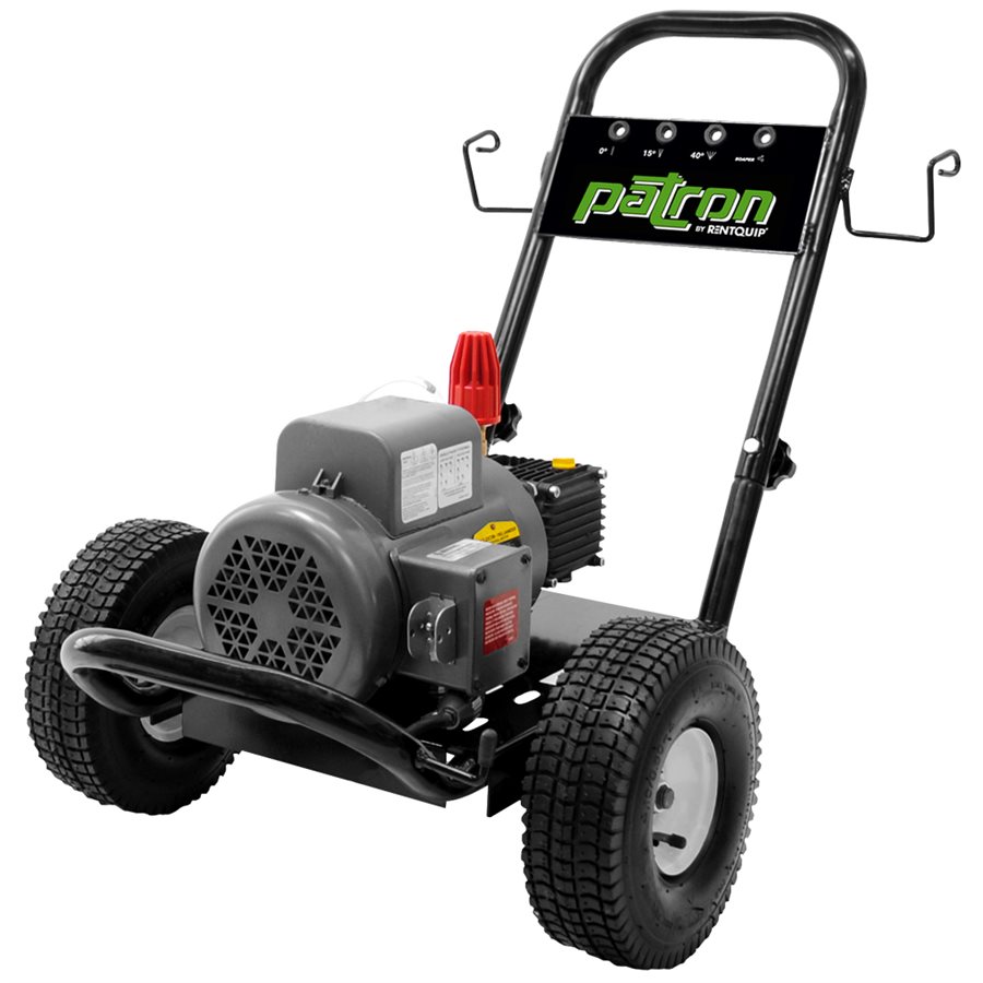The Patron PCE-11 is a compact 1100 PSI electric pressure washer featuring a 1.5 HP Baldor motor and AR JRV2G25E triplex pump. It delivers 2.0 GPM and operates on 120V/15A power. The unit includes a 25' x 1/4" hose, 36" insulated wand, 4000 PSI gun, nozzles, and chemical injector. Built with a heavy-duty powder-coated cart, 10" flat-free tires, and integrated storage, it's ideal for residential and light commercial cleaning tasks.