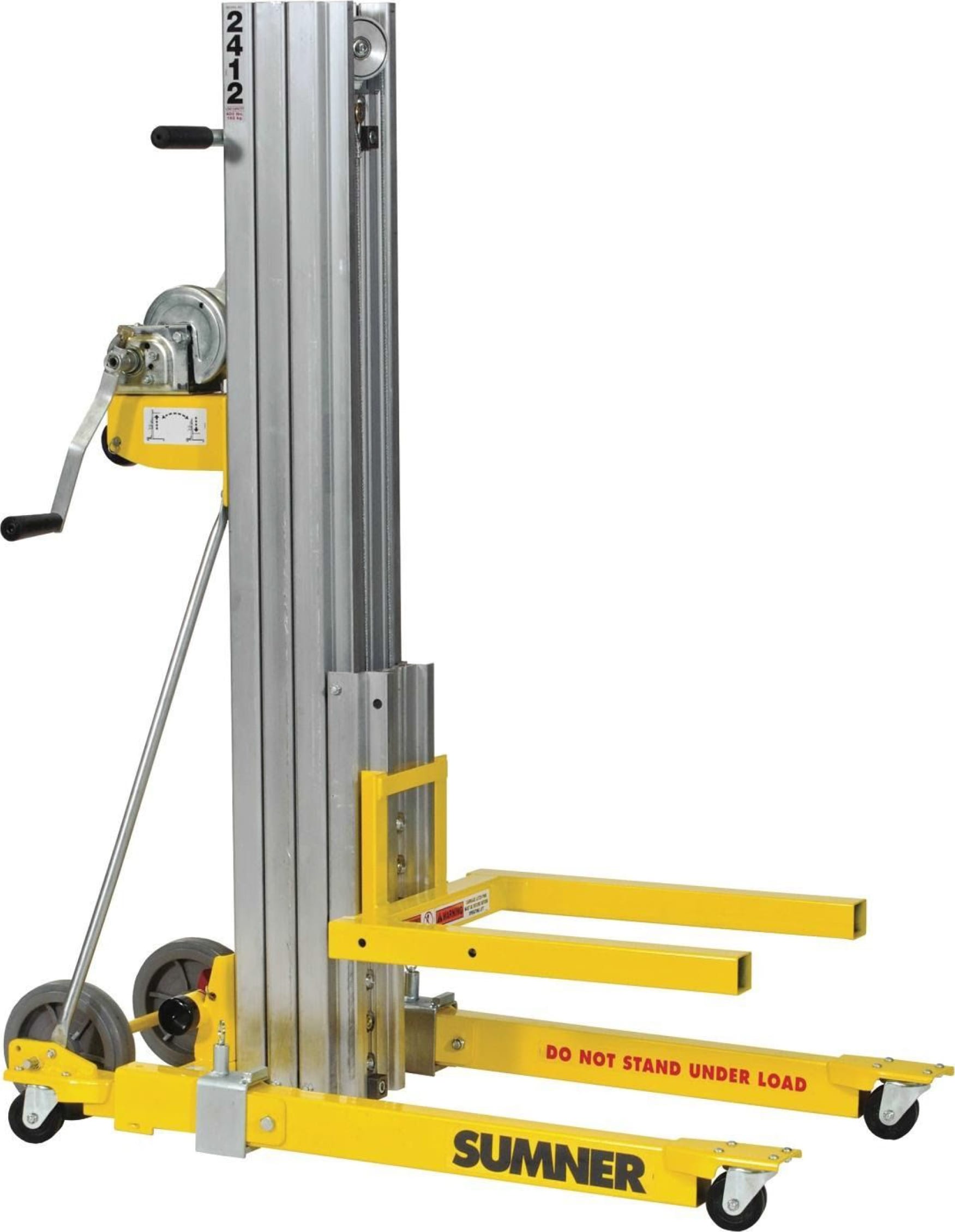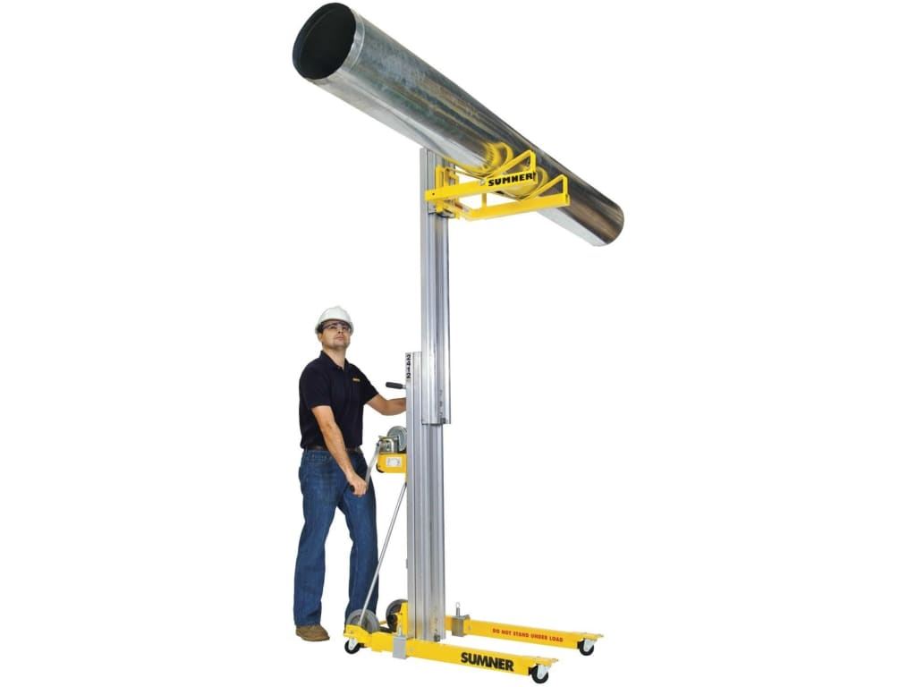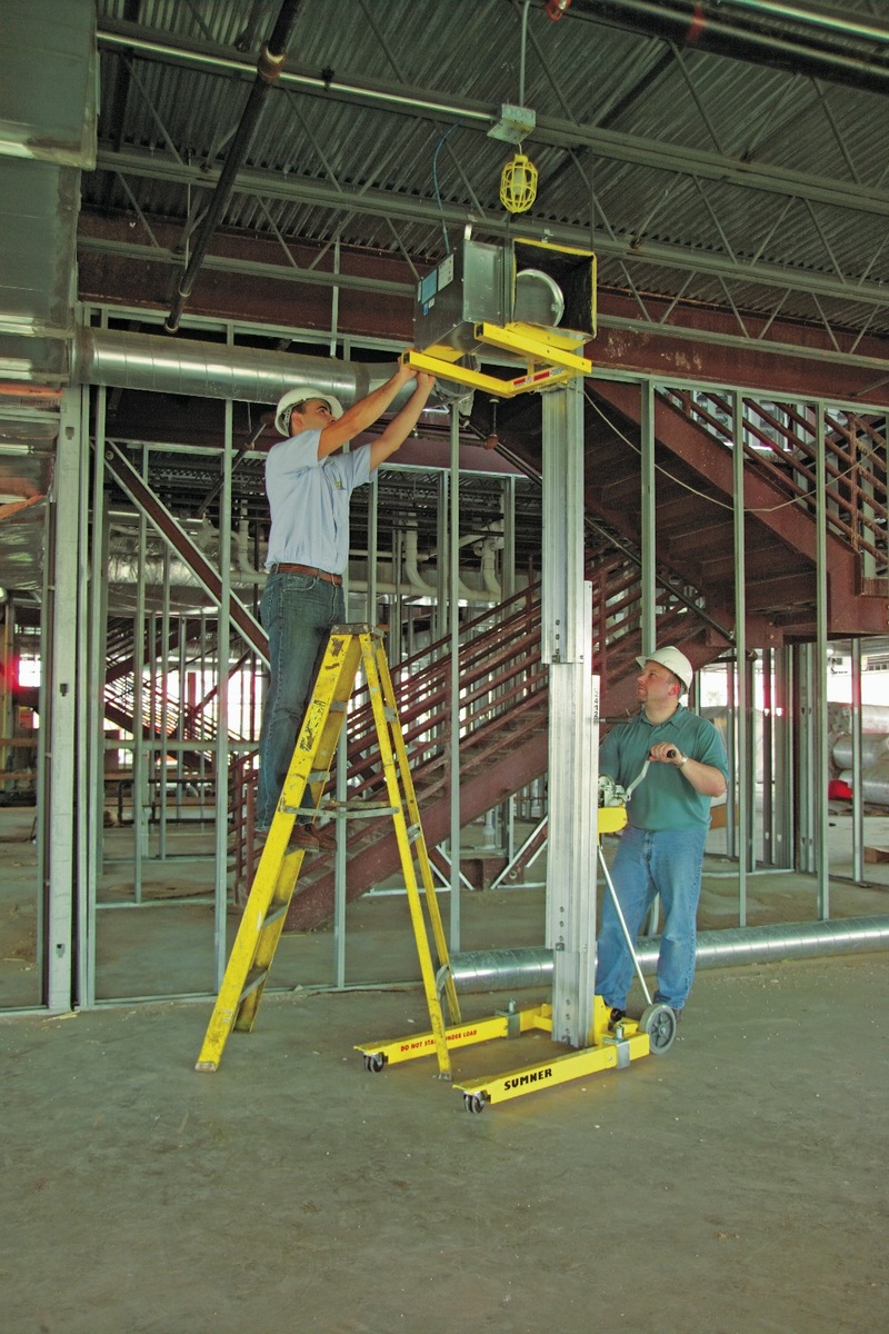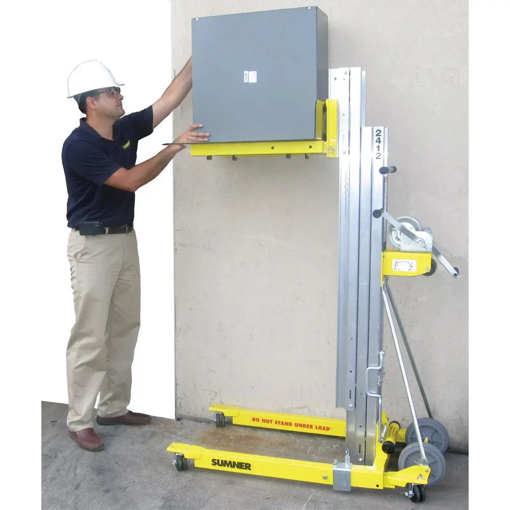 The Sumner 784751 2416 Contractor Lift is a compact, portable material lift designed for one-person operation. With a maximum height of 16' (4.8 m) and a 450 lb (200 kg) load capacity, it's ideal for HVAC, electrical, industrial maintenance, and steel erection tasks. It easily fits in most vans and SUVs for transport.