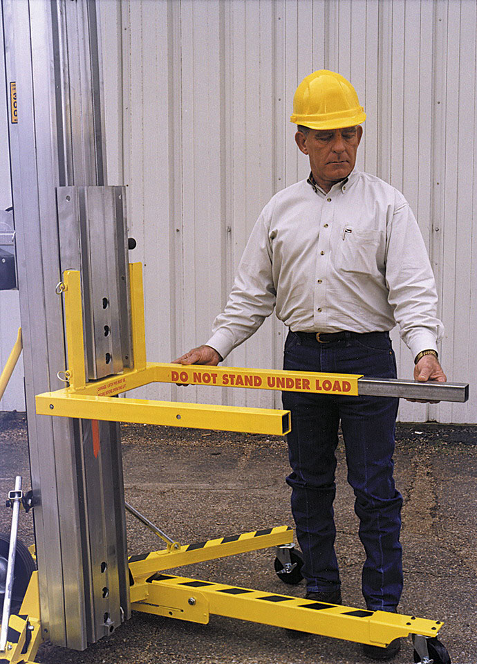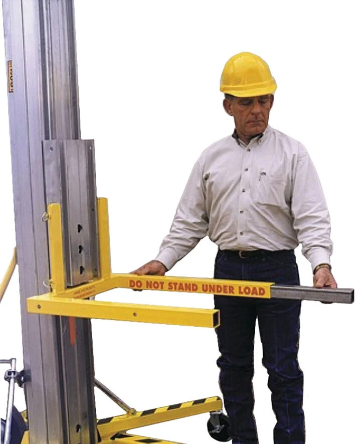 The Sumner 783691 Carriage Fork Extension Kit is designed for use with material lifts. With a simple push of a button, the forks extend from 28" to 42" (71-106 cm). When extended, the weight capacity decreases to 200 lb (90 kg), and the new weight limit is clearly marked. The forks can be easily retracted for compact storage inside the main fork assembly.