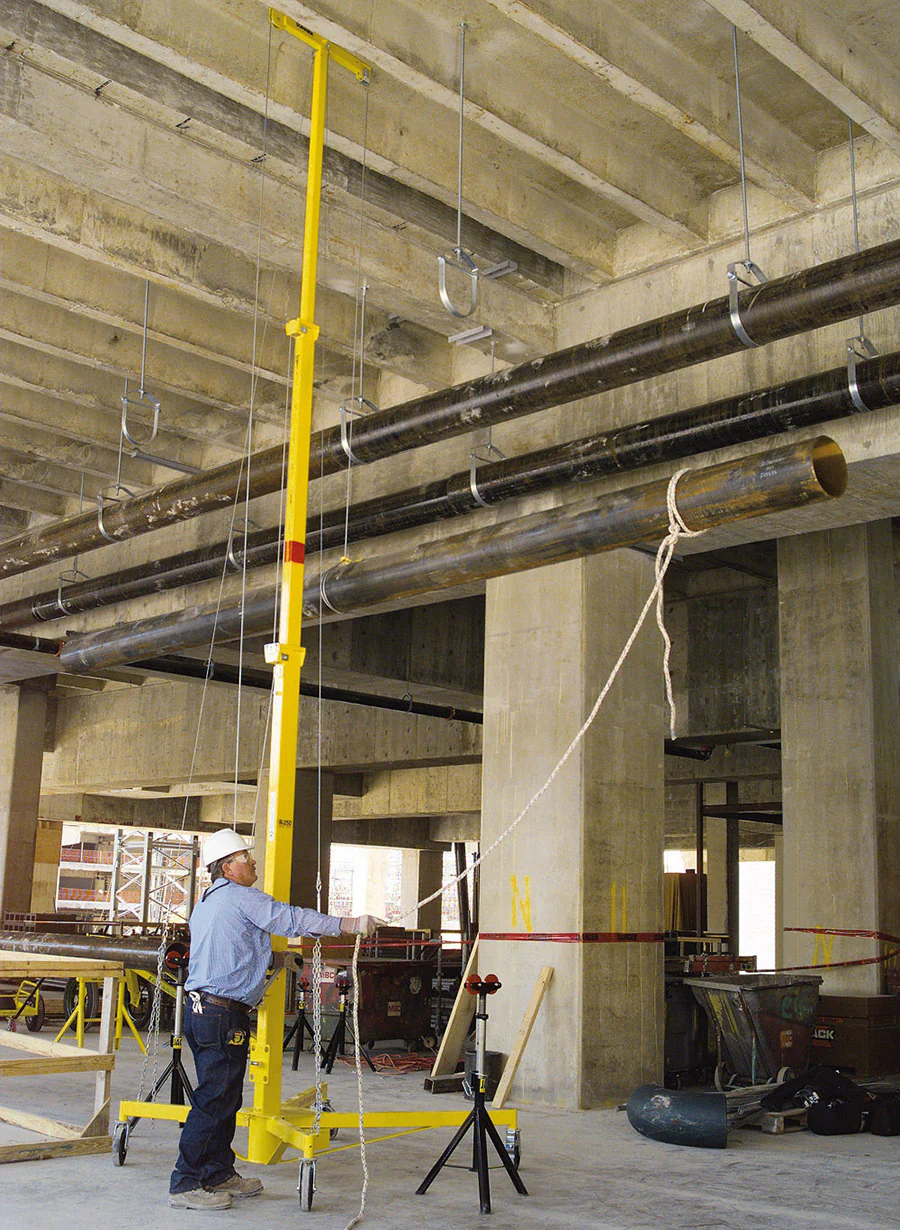 The Sumner R-250 Roust-A-Bout is a versatile material lift capable of raising loads up to 1,500 lb (680 kg) to heights of 25 ft (7.6 m). It features dual winches for separate mast elevation and load lifting, allowing precise positioning. The lift's compact design enables operation in confined spaces, making it ideal for various industrial applications. Additionally, its large 8-inch casters facilitate easy movement of heavy materials on job sites.
