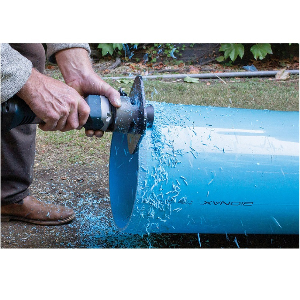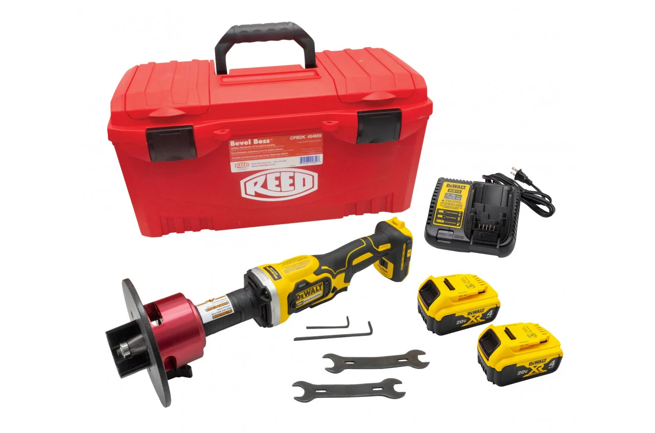 The Reed Bevel Boss® cordless beveler (model CPB2DBCG) delivers fast, smooth 15° external bevels on 2″ and larger plastic pipe. Complete kit includes adjustable adapter head, carbide router bit, 20 V DeWalt die grinder, two batteries, and charger. Lightweight at ~10 lb, it uses long-lasting four-flute bits for clean cuts and features a shroud with guide arrows for OD/ID orientation.