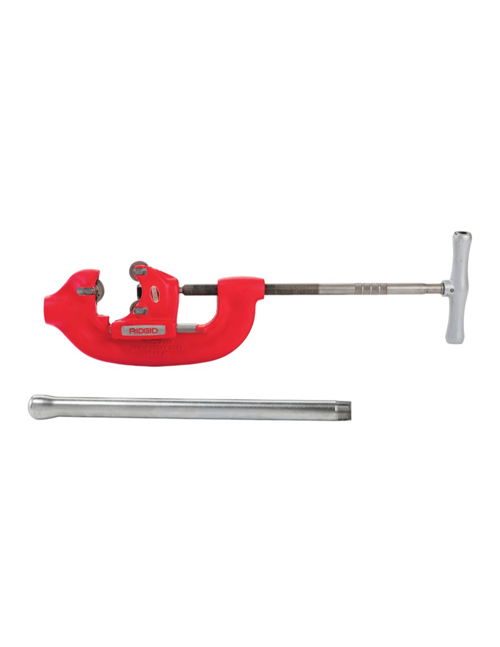 The RIDGID 4‑S (Model 32840) Heavy‑Duty Pipe Cutter handles 2″–4″ steel or ductile iron pipe. Its extra-long shank protects adjustment threads, and the oversized ergonomic handle enables fast, clean cuts by hand or power. Convert it into a 3-wheel cutter for tight spaces. A second handle provides two-person leverage for large diameters. Durable iron body, 25½″ length, weighs 18 lb.