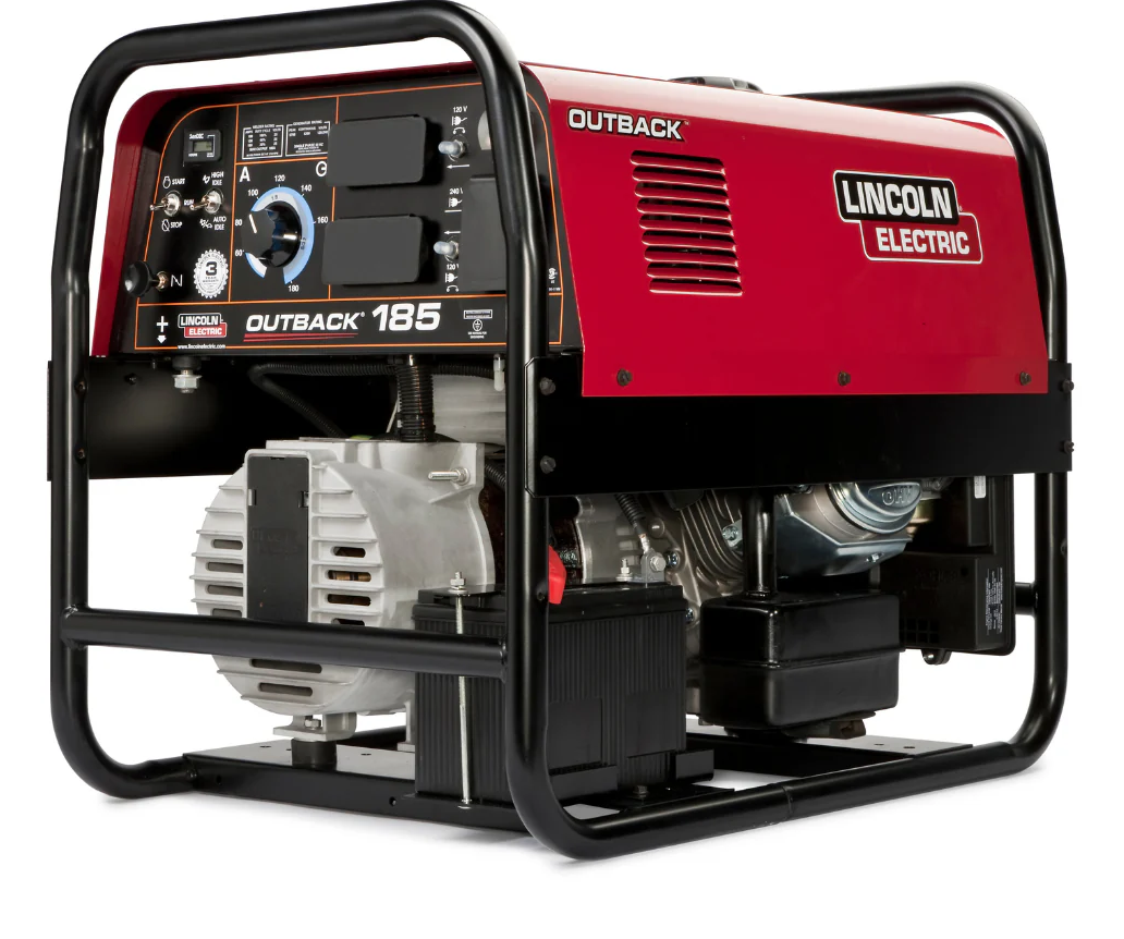 The Lincoln Electric Outback® 185 is a portable DC stick welder with AC generator power, designed for easy transport with Low-Lift™ grab bars. It features front-mounted engine controls for easy operation and a large 6.8-gallon fuel tank for extended use. This machine supports welding and powering other equipment, such as the POWER MIG® 140C and 180C for wire welding.