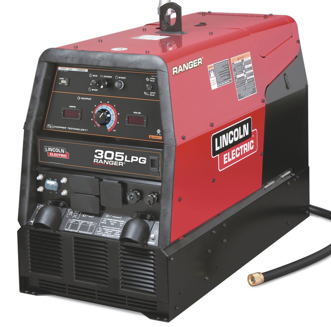 The Ranger 305 LPG is designed for environments where gasoline and diesel emissions are not allowed. It includes a liquid propane gas supply hose with coupler for easy connection to an LP-gas cylinder. With a 10,000-watt peak single-phase AC generator, it powers motor starting, tools, and inverter welders, providing extended range and process capability.