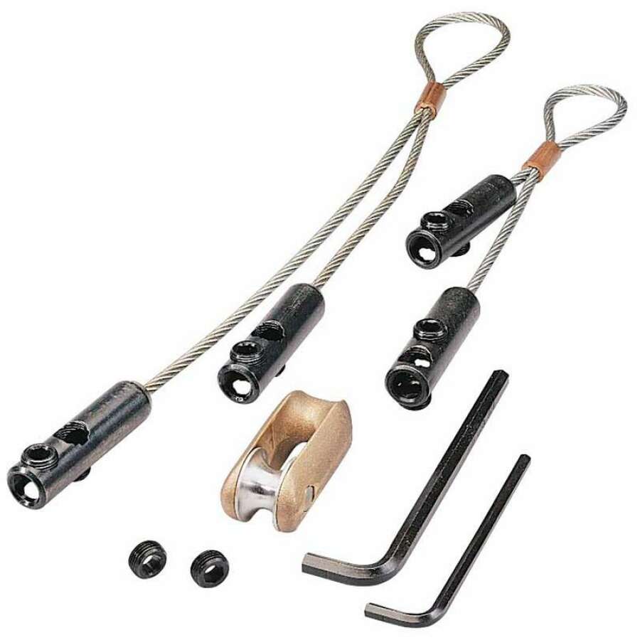 The Greenlee 629 Wire Grip Kit is designed for pulling conductors through 2" (50.8 mm) or larger conduit. It includes a short (624S) and long (624L) pulling grip, and a 678 clevis. The grips feature a flexible 1/4" (6.4 mm) galvanized steel aircraft cable with a 5/8" (15.9 mm) opening and set screws. With a 6,500 lb (28.9 kN) capacity, it's ideal for heavy, long-run pulls.