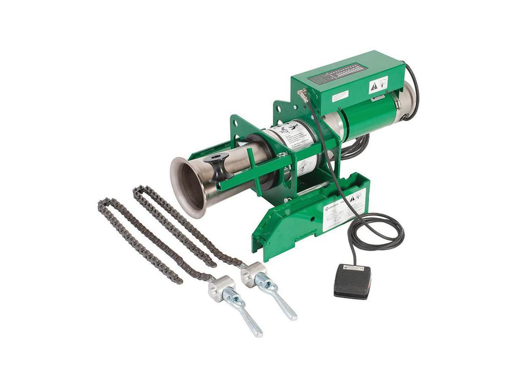 The Greenlee UT10 Puller Package (Cat 6901) features a 2-speed Ultra Tugger® motor designed for demanding cable pulls up to 10,000 lb (44.5 kN) peak. High-speed mode delivers ~16 ft/min (4.9 m/min) no load; low-speed offers ~9 ft/min (2.7 m/min) for heavy draw. Includes on-board force gauge, quick foot-switch speed change, and chain-mount configuration for secure setup. Ideal for both light and heavy cable pulls