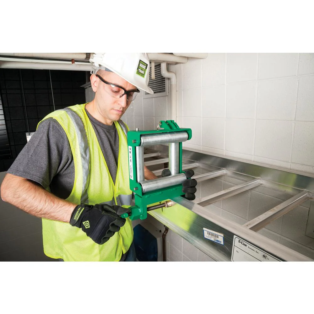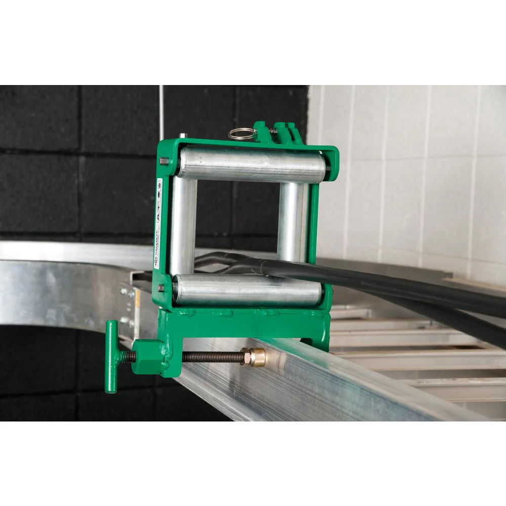The Greenlee CTR100 is a medium-duty tray roller for 4" (101 mm) cable size, rated for pulls up to 100 lb (≈ 0.45 kN). The compact steel guide features a 4-roller conveyor with a retention spring pull-pin for quick cable removal. Setup is fast with a quick-adjust push button and no loose parts. Ideal for assisting cable pulls along non-basket-style trays and around 90° bends.