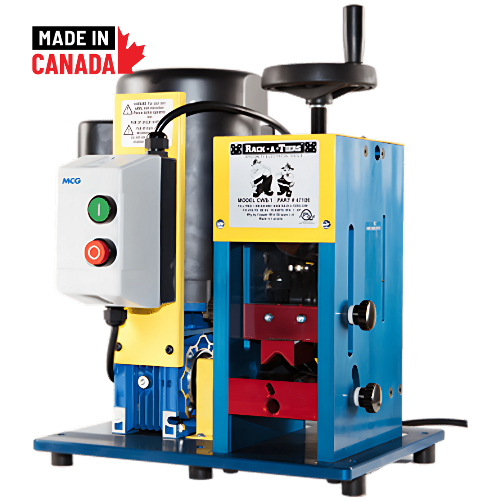 The Rack-A-Tiers Copper Wire Stripper CWS-1 is a heavy-duty, bench-mounted machine designed for efficient wire stripping. It accommodates wire sizes from 14 AWG up to 3" in diameter, including solid core and braided wire. Featuring a 1 HP motor, hardened one-piece tool steel blade, and fully adjustable wire guide, it ensures precise and consistent stripping. Built with an all-aluminum frame and anti-slip base, it's CSA and UL approved and proudly made in Canada.
