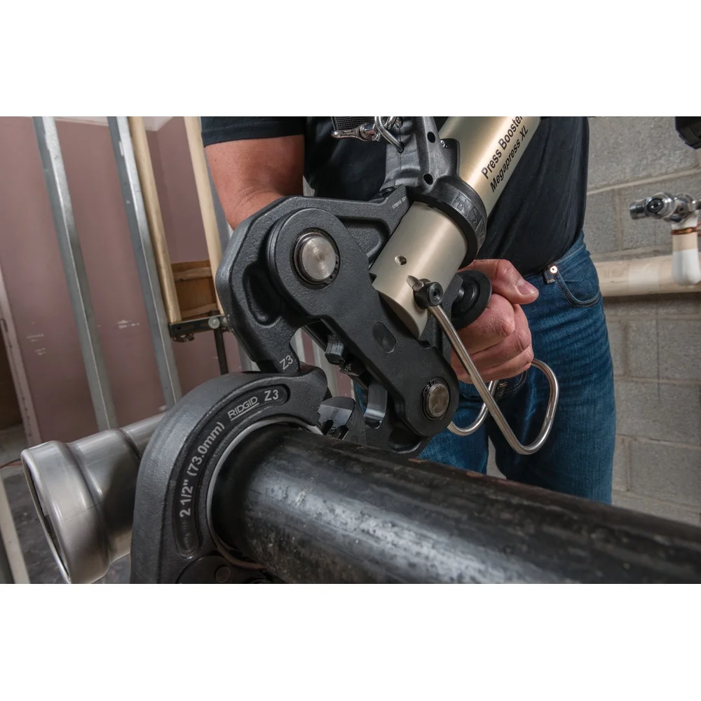 The RIDGID MegaPress XL system enables flameless pressing of 2½″ to 4″ steel pipes in under 25 seconds. Designed for wet systems and pressure fittings, this kit includes a Press Booster and MegaPress XL rings—jointly engineered with Viega® MegaPress XL fittings—for fast, reliable connections without hot work permits. Compatible with RIDGID standard press tools.