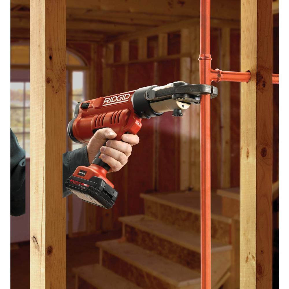 The RIDGID RP 340-B battery press tool kit delivers 32 kN hydraulic pressing force, with a 10-108 mm capacity for copper, steel, stainless steel, PEX, and multilayer tubing. It weighs 3.76 kg with the 18 V lithium battery, operates between –10 °C and 50 °C, cycles in about 4 seconds, and includes the tool, battery, charger, and sturdy case. Integrated LED ensures visibility in low light.